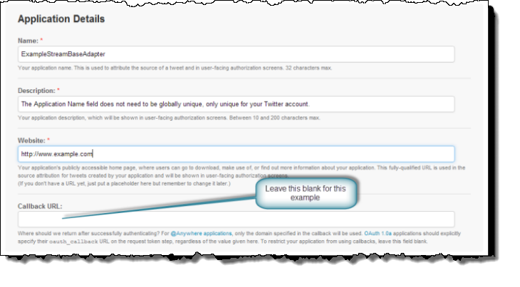 Fill in the Description field. Twitter requires at least 10 characters in this field.