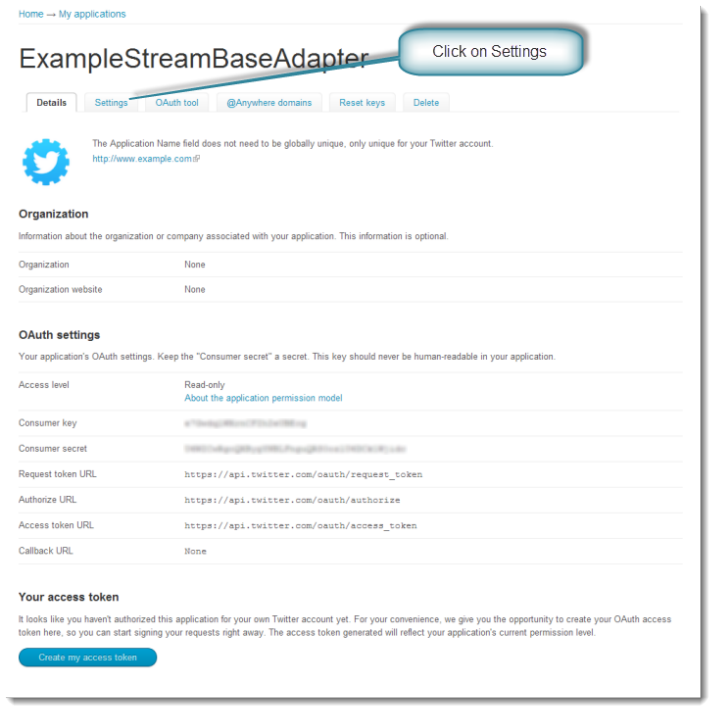 The application has been created. You will see the screen shown below. Click the Settings tab.