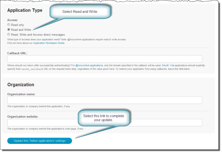 Under the Application Type section select the Read and Write radio button (Note: if you plan to send and receive direct messages with your application, you must instead select Read, Write and Access direct messages). This allows your application to receive and post tweets. Click Update this Twitter application's settings to complete the update.