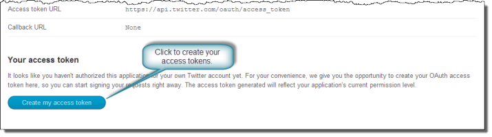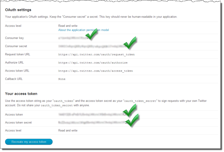 Copy, label, and save the Consumer Key , Consumer Secret , Access Token and Access Token Secret strings provided on this page. You will need to enter these tokens in your Twitter input adapter's >.