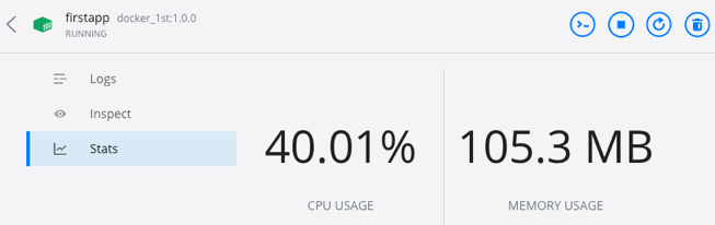 Select a container to see more detail, which opens to the Logs panel. Use the buttons on the top row to run basic start, stop, restart, or delete commands for the running container, and to open a shell prompt inside the container. Use the menus on the left to inspect the container's basic settings and view its statistics since startup.