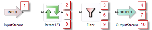Remember that a Split operator processes tuples in the known sequence of output port order. Thus, the next downstream operation is to go back to the Split operator and traverse the second output port, shown as step 7.