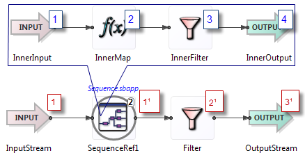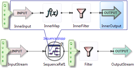 Inner, which is inside a module namedOuter. The execution order is the same as if you had copied the entire verbatim contents ofInnerintoOuterat the point of the module reference. When a tuple emerges from one ofInner's output streams, that tuple becomes available inOutercompletely and is processed there to completion throughout the rest ofOuter.