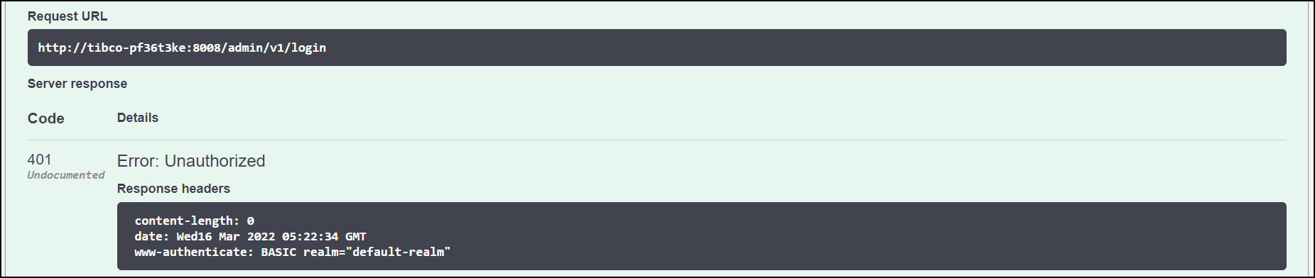 POST /login— Login to admin web service: From REST API, select Try it out and click Execute. The response body presents the username and Password. Enter the login credentials and click on Sign in to enter to Admin Web Services. On successful command execution, the file URL is returns Code 200 response box: