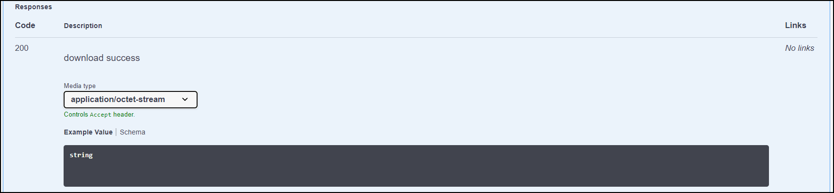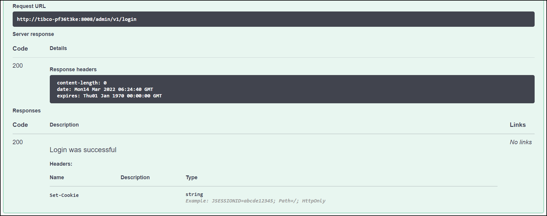 POST /logut— Log off from admin web service: From REST API, select Try it out and click Execute. On successful command execution, the file URL returns Code 200 response box: