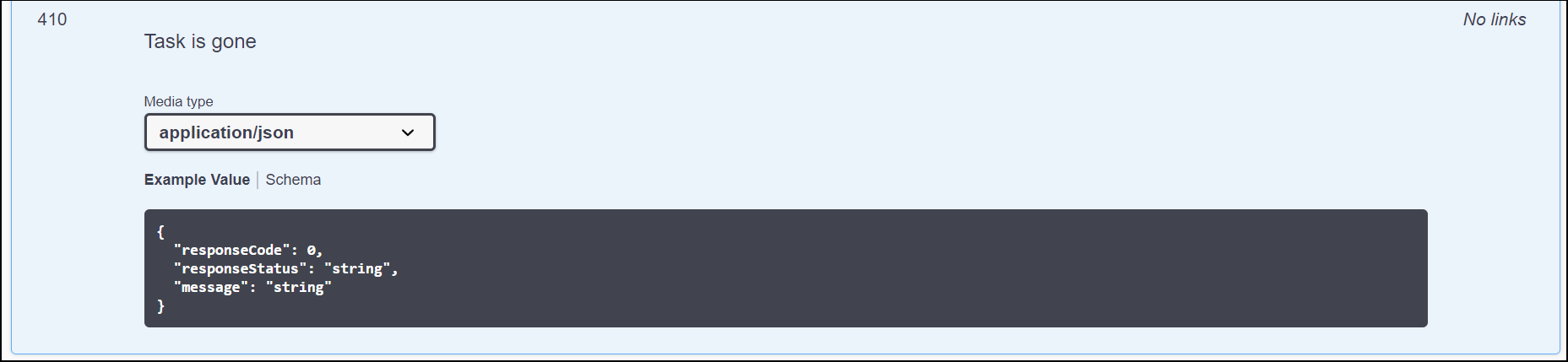 If the entered task is not active task, then then URL returns Code 410 response box with Task is gone error: