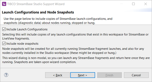 Click . In the Launch Configurations and Node Snapshots dialog, choose whether to include copies of StreamBase launch configurations, and snapshots (diagnostic data) about running or stopped nodes.