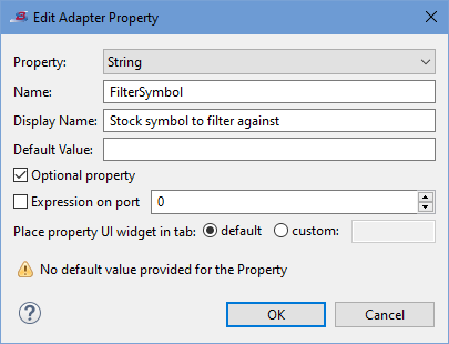 Specify one or more properties that can be set or modified by users of your adapter to control its operation. For each property you specify, the wizard generates code to place a control in the Adapter Properties tab of the Properties view for your adapter's icon. See Adding Adapter Properties for details on using this section.