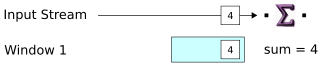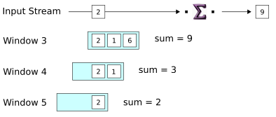 The diagram shows the aggregation function that is performed on the window (even though here it is only a sum of one number). As more data is enqueued, the window keeps a running sum of tuple values.