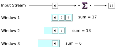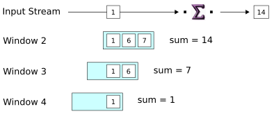 2, a new window would open every two tuples (in the next step) instead.Notice the positions of the two windows relative to the tuples in the input stream. For readability, the diagram represents each window separately. In fact, both windows operate on the same data. A more realistic representation might show a succession of overlapping windows moving over a single stream of data.
