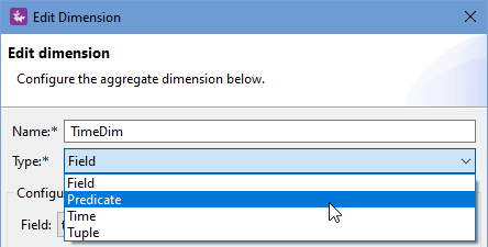 Open the Edit Dimension dialog in one of the following ways. In the Properties view for an Aggregate operator, in the Dimensions tab: