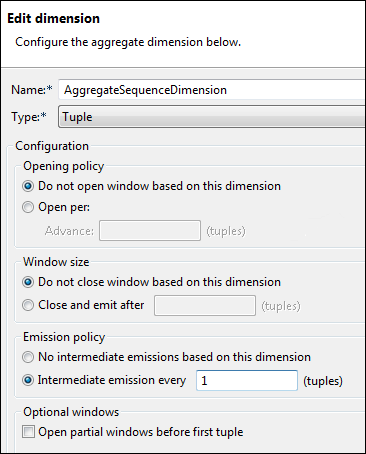 That combination of settings creates a window that never closes (while StreamBase Server is running, of course). Also notice the setting of the Emission policy, which gives you the option of emitting output before the window closes. Here, the policy is set to Intermediate emission every 1 tuple. This means that, as every tuple arrives, one tuple is emitted.