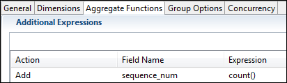 You can define more than one dimension to cover different runtime conditions. In the case of multiple dimensions, the Aggregate operator uses the first dimension whose rules can be applied. The selected dimension, and only that dimension, applies to all the Aggregate operator windows. Notice that even an Aggregate operator that specifies more than one dimension in the Dimensions tab still specifies a single set of aggregate functions in the Aggregate Functions tab. That is, you cannot in the same operator apply one aggregate function to one dimension, then a different aggregate function to another dimension.