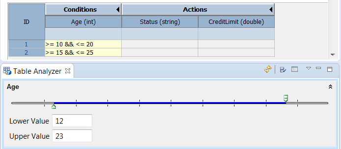 The preference (see Decision Table > Analyzer Panel) determines whether rows whose condition falls completely or partially within the specified condition range are highlighted.