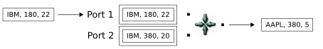 A tuple enters on the second port. This time, the conditions for the gather operation are met: the key field is matched by tuples on both input ports. In the gather operation, the volumes of the AAPL tuples are summed, the result is emitted in an output tuple, and the matching tuples are released from the buffer.