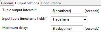 Specify a number or an expression that evaluates to seconds for the Tuple output interval and Maximum delay properties. You can can also enter these values as a parameter in the form ${parameter}.