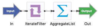 This example illustrates how to create a new list whose contents are a filtered and transformed version of an input list, using a single Iterate operator followed by an Aggregate operator.
