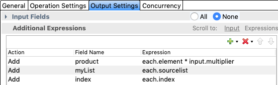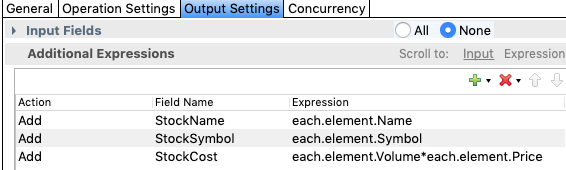 is shown only to illustrate the use of the each construct; to pass the incoming fields through without the rename, use the Input Fields grid.) The third output field calculates the total cost of the stock purchases in the input list.