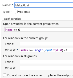 Configure the AggregateList operator with the following Predicate dimension settings. This fills an aggregate window with the contents of the tuples