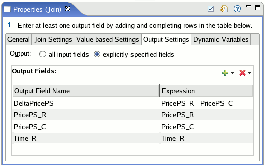 The Output Settings tab allows you to specify the field names and expressions this Join operator should release. Release occurs