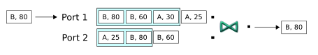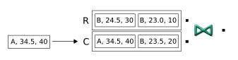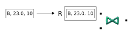Next, a tuple enters the second input port, and it matches a tuple in the first buffer. Therefore a Join occurs, and the operator releases a matching tuple. In addition, notice that when the window is full and a new tuple arrives, the window advances over the stream of tuples: the oldest tuple in the window (B, 60), is flushed from the window.