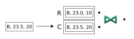 A tuple enters on the ComstockIn port (shortened to C). The value of its first field (B) matches the symbol in the first tuple, but the price difference (in the second field) is less than one. Therefore, nothing is released by the Join operator: