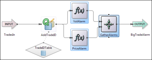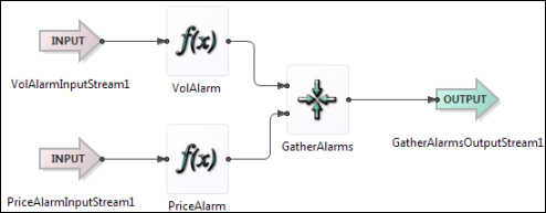 In the EventFlow Editor, select a contiguous group of components to include in the application module. In the following example, the selected group includes two Map operators and a Gather operator: