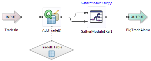 Notice the input and output ports on the Module Reference icon, which StreamBase has connected to appropriate components in the parent module.