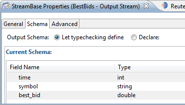 | Declare | By declaring an expected output schema, you ask StreamBase to compare the schema received by this output stream to the declared