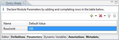 upstream. You can specify the row limit at runtime by using an expression such as ${RowLimit} in this field, then specifying a module parameter for the containing module named RowLimit.