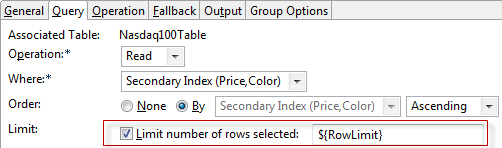 For Read and Delete operations, if you chose a Where setting that returns more than one row, you can specify a limit to the number of rows returned by your query. To do so, enable the Limit option and enter a StreamBase expression that evaluates to a positive integer, which is taken as the maximum number of rows to return.