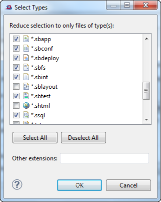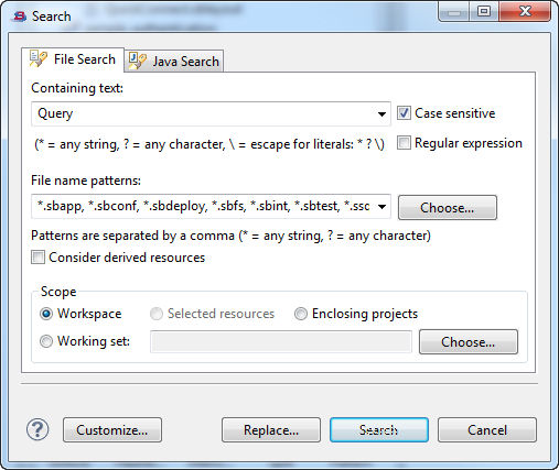 To make the Eclipse File Search feature useful in the StreamBase Studio context, use the first Choose button to restrict the search to the StreamBase file types of interest.
