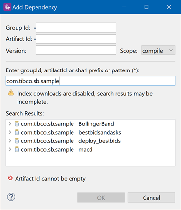 com.tibco.sb.sampleorcom.exampleto narrow the list to the fragment archives you have created for samples. For your own projects, enter the first portion of your company's group ID.