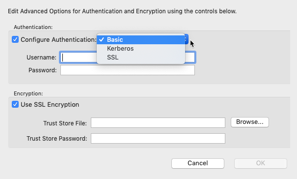 The Apache Kafka option for Studio's LiveView Connectivity Wizard now supports creating Kafka projects with basic and advanced authentication options. Click the Generate Security Settings link at the bottom of the Advanced Options grid to open the following dialog. You can select Basic-only by clearing the Use SSL Encryption check box, or select the combination of Authentication and Encryption settings appropriate for your Kafka cluster.