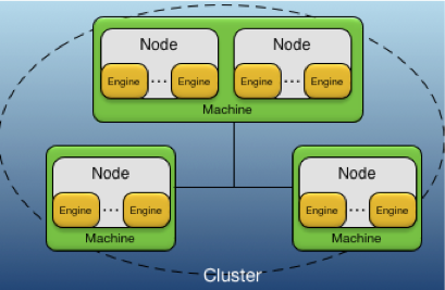 Your application can eventually be built up to run on many nodes hosted on several machines, including machines geographically separated.
