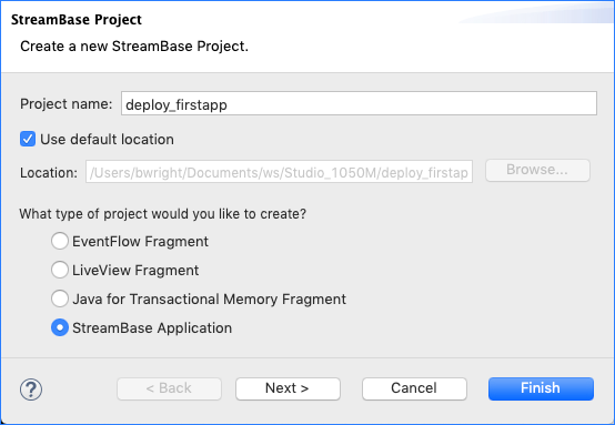 In the dialog's first panel, enter a name for the project, and select StreamBase Application as the project type. TIBCO suggests choosing a name for this project that starts with "deploy" to distinguish it from EventFlow and LiveView fragment projects.
