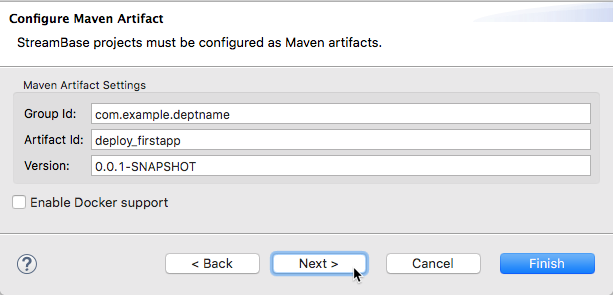 com.example.deptnameto match the Group ID of the fragment you created on Create a New Studio Project.You are not required to use the same Group ID for a StreamBase Application project as for its dependent fragment projects, but doing this brings clarity to the process.