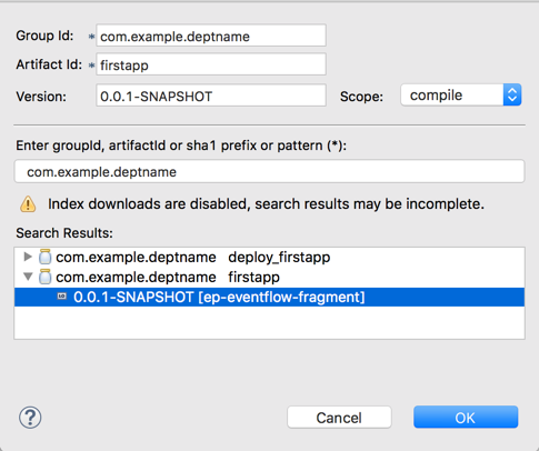 When you select the fragment archive, Studio fills in the Group Id, Artifact Id, and Version fields of the dialog. Click .