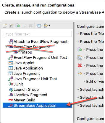 In the Run Configurations dialog, select the StreamBase Application category on the left. (Do NOT select the more familiar EventFlow Fragment category.)