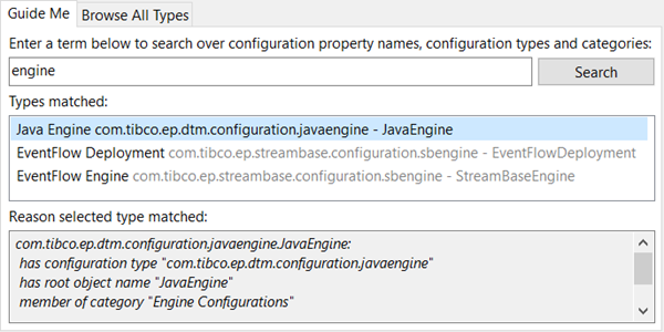 To view a list of every available configuration type, click the Browse All Types tab. Enter a search string in the type filter text field to reduce the list to types that match that string.