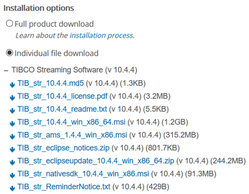 On the TIBCO eDelivery download page for the desired TIBCO Streaming software release, select the Individual file download method.