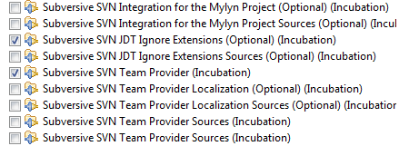 If, for any reason, you are installing Subversive on your own, you must also install the Subversive SVN JDT Ignore Extensions plug-in. Although it is marked as optional, this plug-in is essential to give Eclipse the knowledge of what file and directory