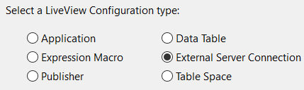 One of the basic types of LiveView Configuration files (lvconf files) is the External Server Connection type. This configuration is used to define a source of data for a base LiveView data table, where that source is one of: