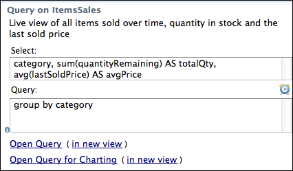 ItemsSalestable and the average price of all these items, enter nothing in the Query window and the following text in the Select window:sum(quantityRemaining) AS totalQty, avg(lastSoldPrice) AS avgPrice
