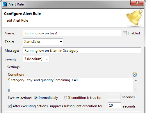 Running low on $Item in $category. The expressions$Itemand$categoryperform text substitutions when the alert rule is executed and return the value of the Item and category fields from the row of the ItemsSales table that meets the alert conditions. -