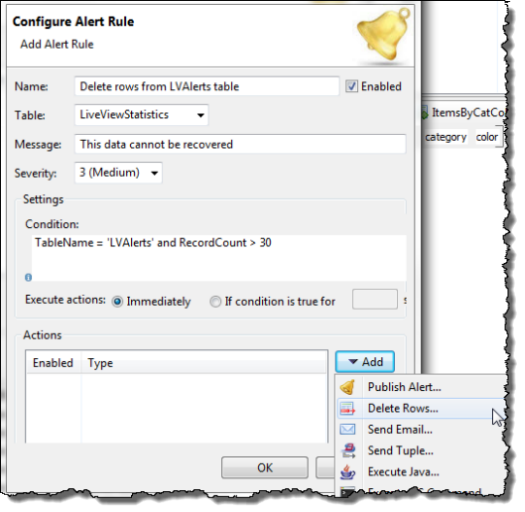 You can also delete rows with an alert action. For example, you may want to control the number of rows published to the LVAlerts table. This example deletes all the rows of the LVAlerts table when it gets larger than 30 rows.