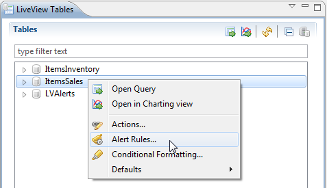 Follow these steps to create an alert against the ItemsSales table from LiveView Desktop and publish the alert to the LVAlerts table.