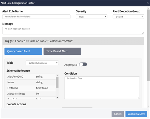 a rule against the LVAlertsRulesStatus table for the condition Enabled == false: