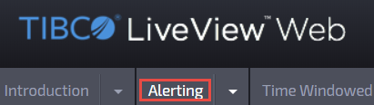 You can be notified when LiveView Server disables an alert rule by configuring an alert rule against the LVAlertsStatus table. The LVAlertsStatus table is a system table that appears in every compiled LiveView project. To see this table from LiveView Web, click the Alerting menu: