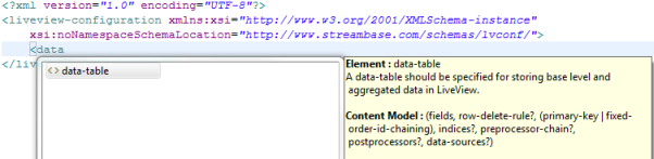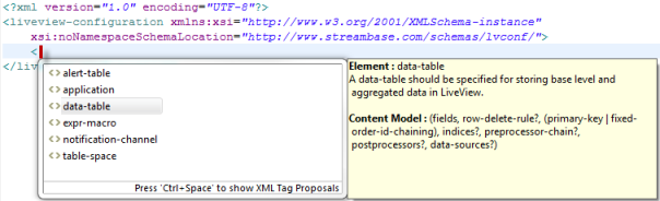 The text-based XML configuration file editor is a validating XML editor that is aware of the schema that defines the XML syntax of LiveView configuration files.